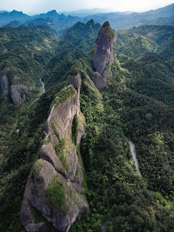 突兀耸立的岩石,冲破山峦的平缓轮廓,于茂密翠绿的植被簇拥中醒目而立。坚硬岩石与蓬勃绿意鲜明对照,蜿蜒山路穿梭其中,似在倾诉人与自然的奇妙交融,尽显雄浑与生机兼具的独特之美。