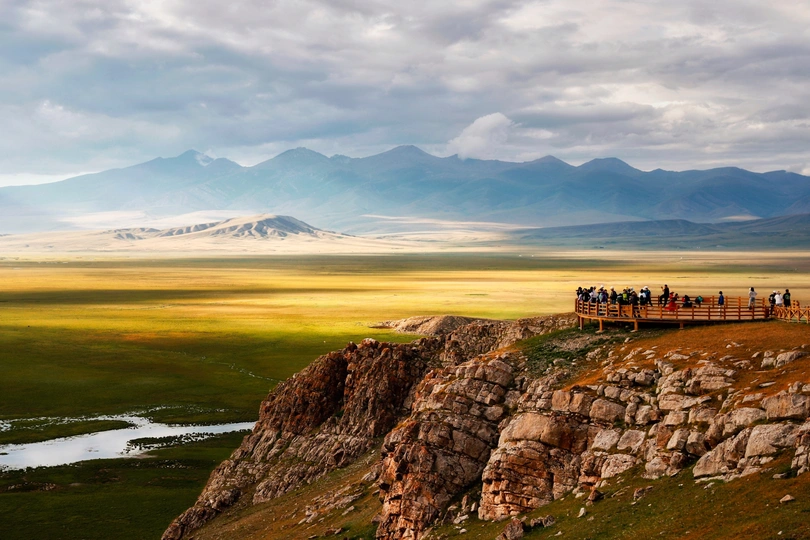 在巴音布鲁克等待日落,黄昏的光线透过云层撒了下来,在草原与远山之间形成了美丽的光影。