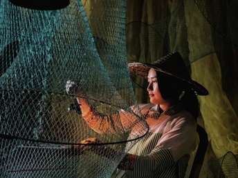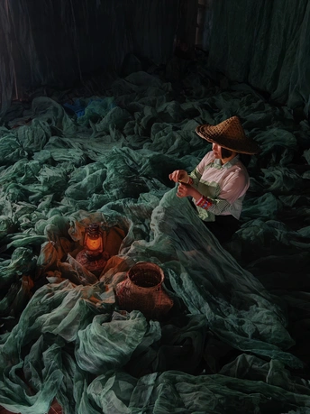 一双巧手正修补着损坏的渔网,眼睛看着手上的竹篾穿梭在网眼之上,煤油灯、斗笠、渔蒌是母亲们留下的,每一个海边的女人都和男人们一样怀揣着捕鱼丰收的梦想。