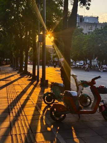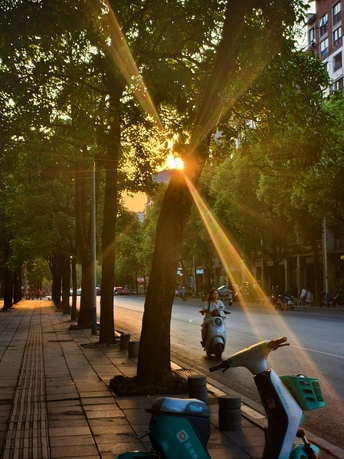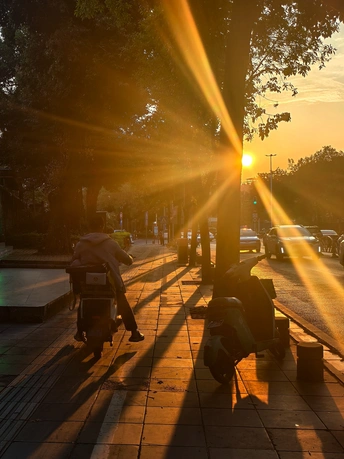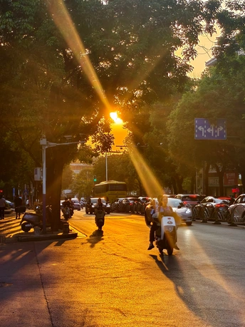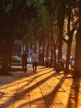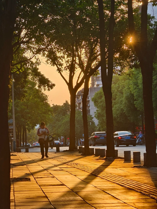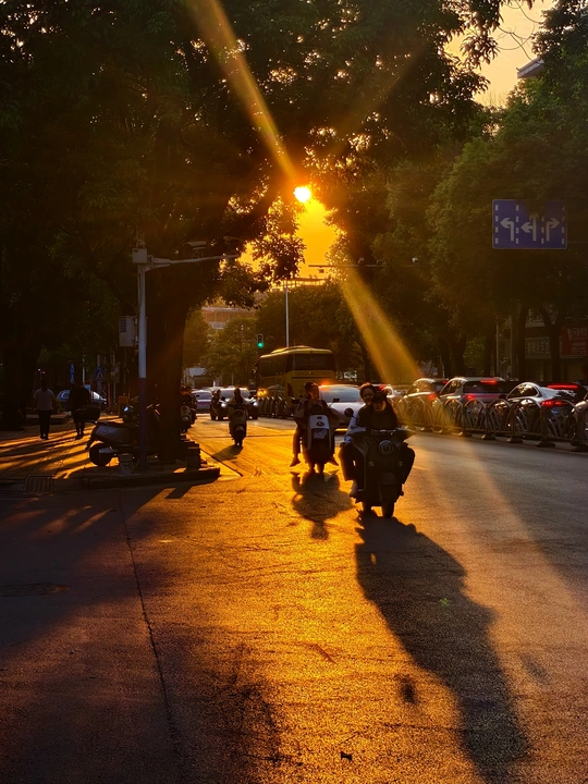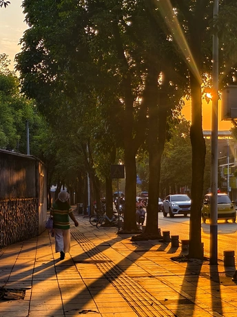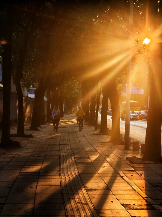 下班途中,夕阳余晖如金纱般倾洒,路上的行人和车辆都被镀上了一层暖黄。