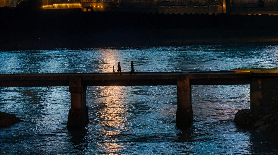 夜桥浮光,步履成诗。 三个剪影牵着整条河的温柔, 把灯火走成星群的模样。 ——最暖的归途,不过是一盏灯等三颗心。