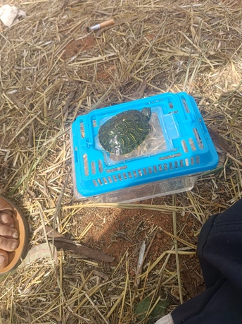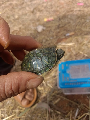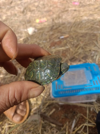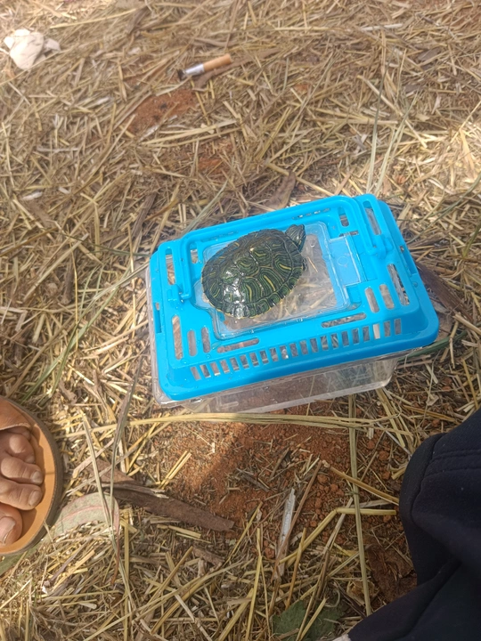 这只小乌龟被放置在一个蓝色的塑料容器中,容器坐落在一片干草地上。周围散落着一些泥土、树枝和杂物,显得有些凌乱,但却为小乌龟增添了一份自然的氛围。小乌龟的壳呈现出深绿色,上面有着不规则的花纹,像是大自然赋予它的独特铠甲。它的头部和四肢伸缩自如,在狭小的空间里缓缓爬动,眼神中透露出一丝谨慎与好奇。