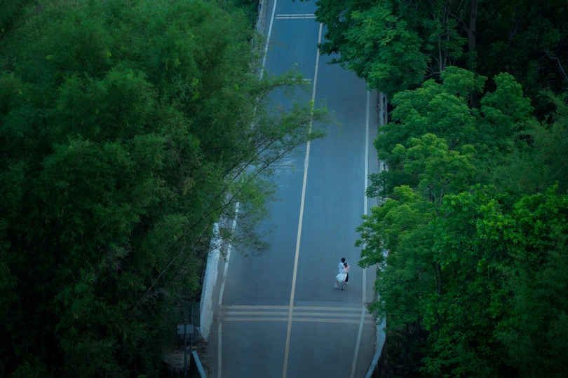 在山顶等着看日落,虽然当天日落没有看到,阴沉天气下,低头一看山脚,一对情侣骑着车路过小桥,赶紧来一张,记录下自认为浪漫的时刻