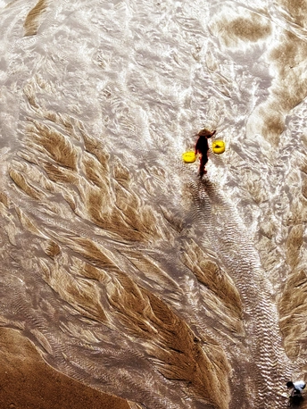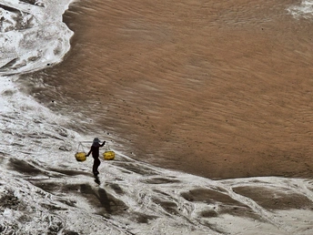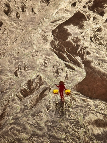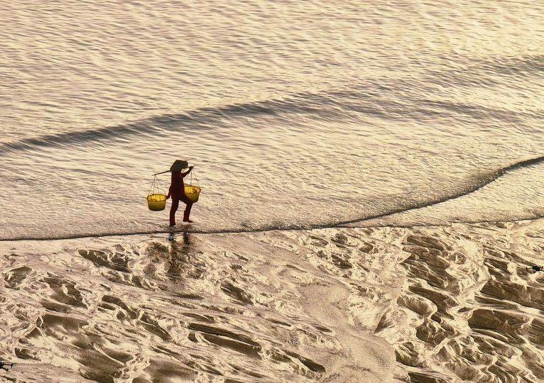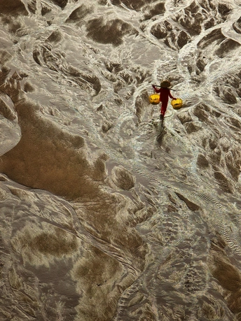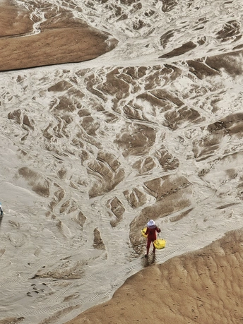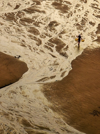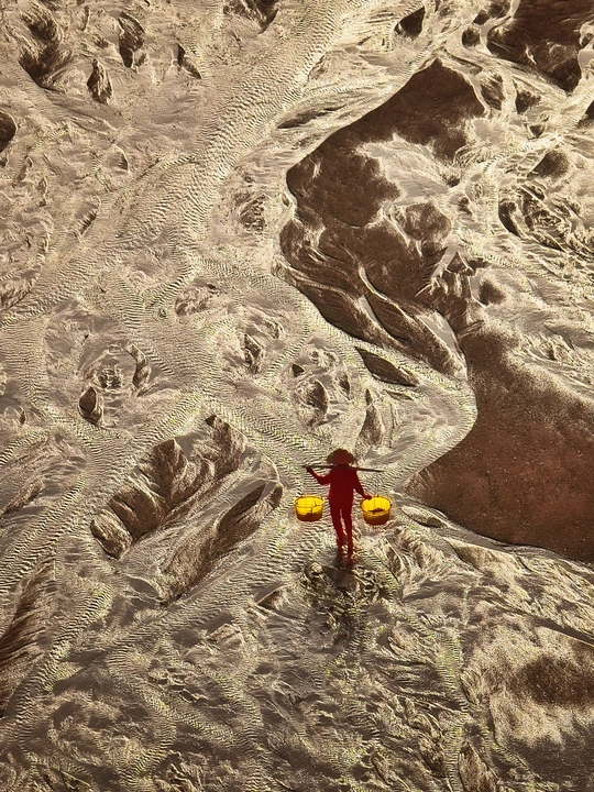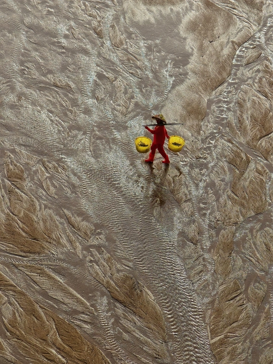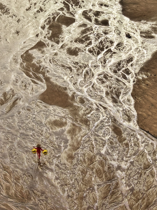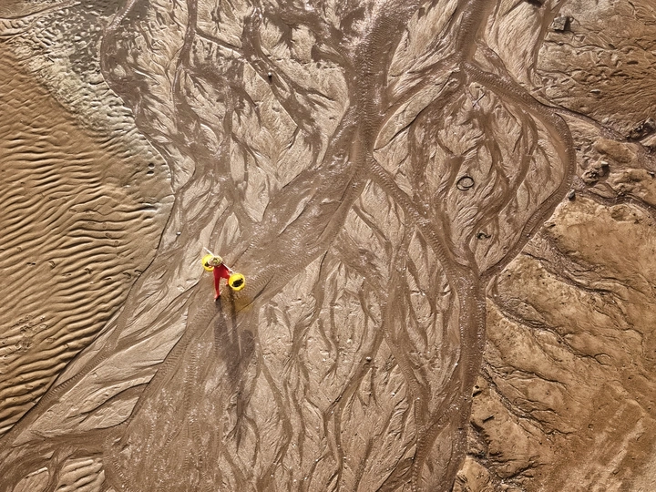 滩涂似大地的诗篇,纹理如岁月笔触。霞浦的渔家女红衣亮眼,挑着箩筐穿行其间,于光影交错处,踏出生活的节奏。他是这滩涂的行者,在自然的馈赠里,寻找平凡又珍贵的烟火。