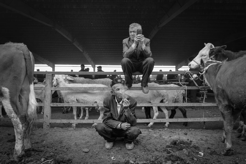 在新疆每周一次的牛羊大巴扎,两位绅士正在等待交易的机会。
