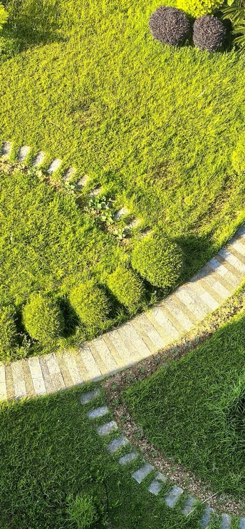 阳光照射下,一条石径把空中草坪分割成了阴阳两边,有点太极☯️图的意思。不同颜色的树球散在草坪上,起到点缀作用,不规则的排列让画面生动起来,也令画面更有层次感。