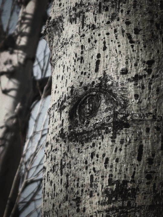 他静静地注视着周围的一切,光影交错间,仿佛能看到时间在他身上留下的痕迹。我站在他跟前,看着这些“眼睛”,似乎能从中读出这片森林的故事。天空的一角透过树枝露出,与树干上的光影一起,构成了一幅自然的画卷。树木的年轮,是它记忆的载体,每一道纹路都记录着它经历的春夏秋冬,就像一本打开的书,等待着有心人去解读。他凝望着世界,有谁会走进他心里,或许他也在向往远方的生活。他静静地屹立在那里,千年万年……