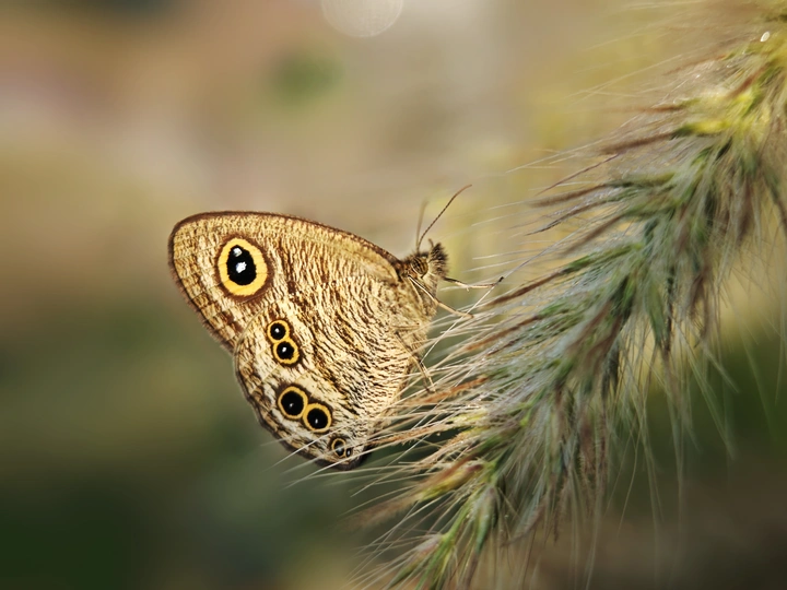 清晨,一只融斑瞿眼蝶在狗尾草上伫立。这种蝶前侧身上有一个大眼睛,后翅上有5只眼睛,全身有(1+5)*2=12只眼睛。