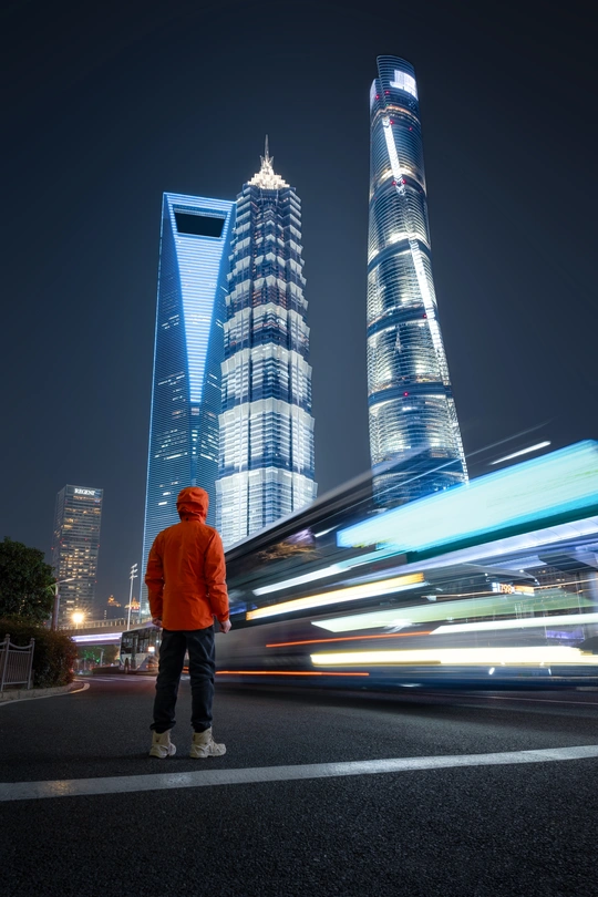 拍摄于繁华的上海陆家嘴,上海三件套矗立于我的面前,非常震撼。使用广角端拍摄,一辆公交车正好从我面前经过、长曝光之下,车辆形成了光轨,非常有意思,与繁华的夜景正好相互映衬。 拍摄器材:索尼a7m4、适马1424mm 拍摄参数:24mm、f7.1、2s、iso100