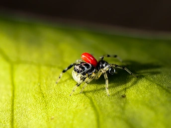 小小的跳蛛背起一个来路不明的寄生虫,可能是不舒服吧,在那片叶子上左跳又跳不停歇的活动,是想卸下这个包袱?还是有了这么个漂亮色的点缀激动的心情停不下来?小小的微生界真的奇妙!