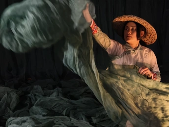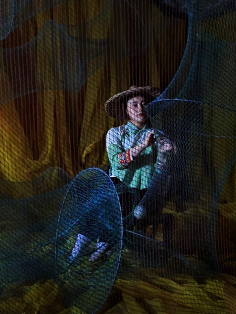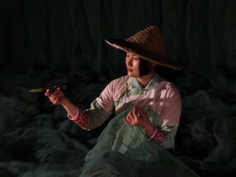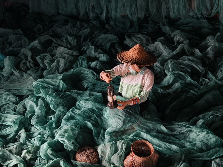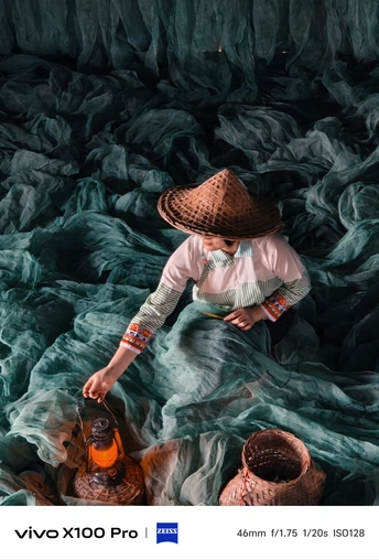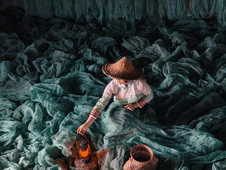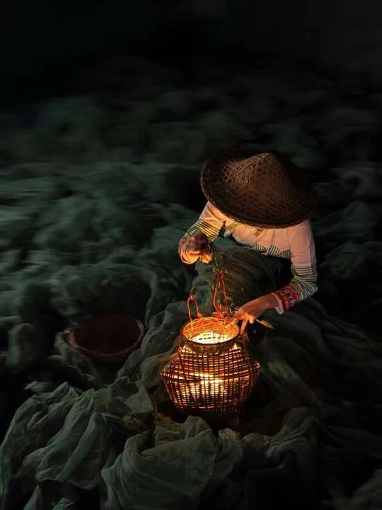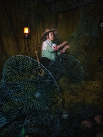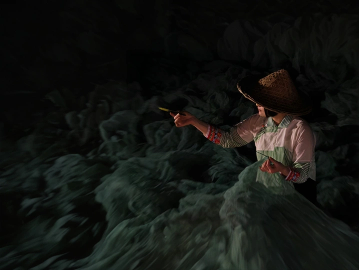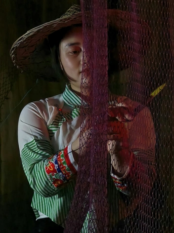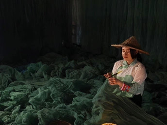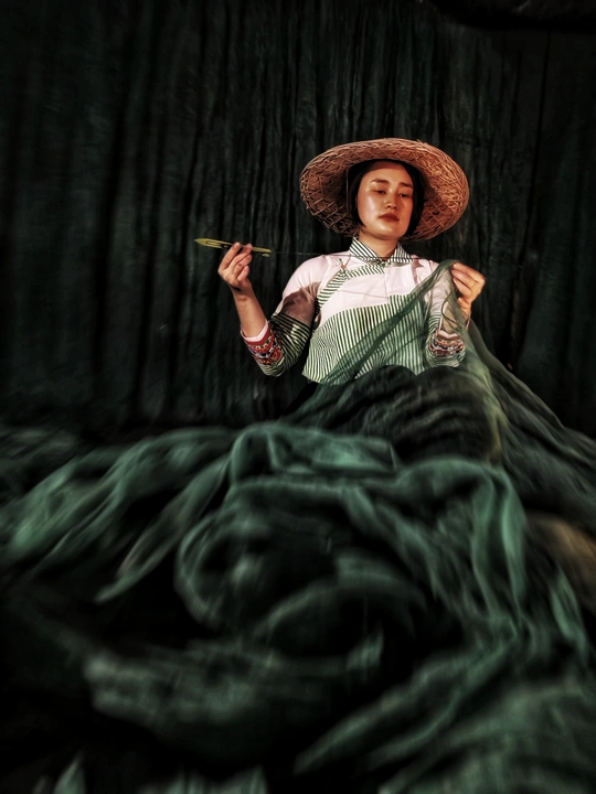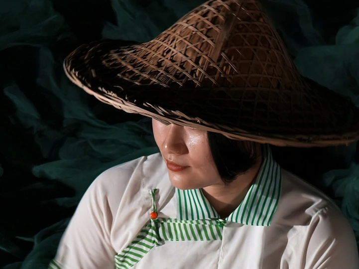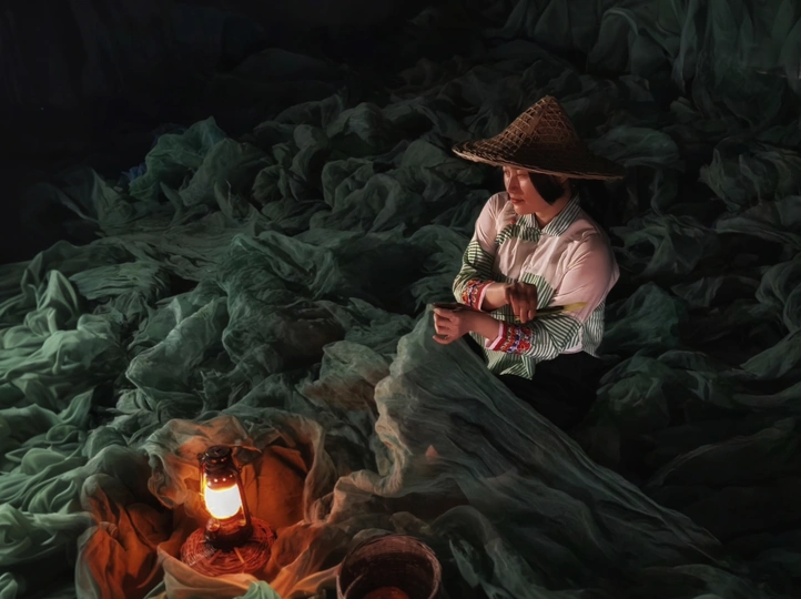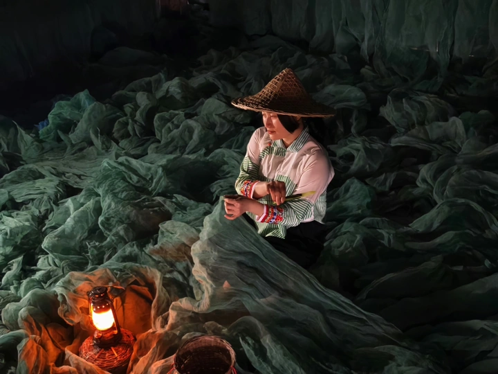 在幽微的光影下,头戴篾笠,于绿纱的世界里穿梭。手中的针,似是连接现实与梦境的丝线,每一次捻动,都编织着独属于自己的宁静与温柔。