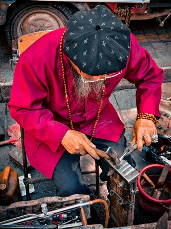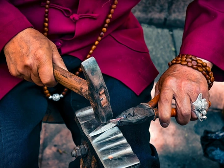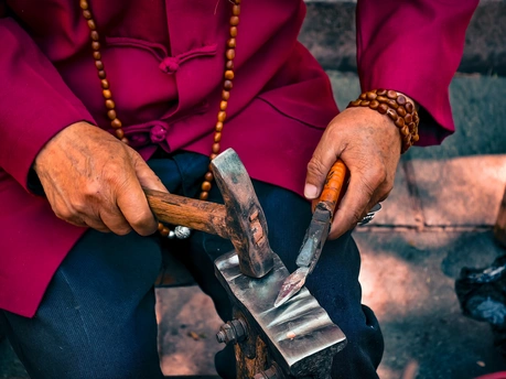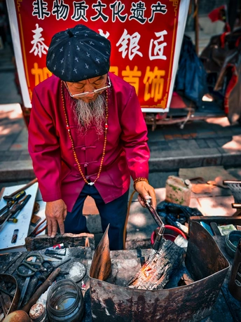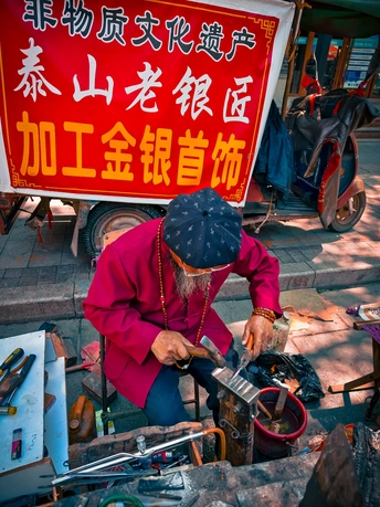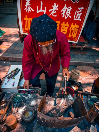 淳朴的笑容,简陋的工具,布满被纹的手千锤百炼的敲打,一丝不首的的雕琢,对银饰工艺的严格把控…这些都是泰山古法非遗银饰老银匠的匠心体现!