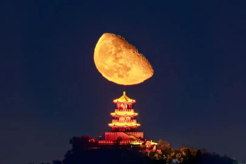 在这一幕凝固的瞬间,月亮不再是遥不可及的天体,而仿佛被一座千年古塔轻轻托举于夜空之巅。明月半悬,灯火辉映,天地之间仿佛达成了一种静谧而神圣的默契。塔楼之光透着历史的温度,而月色之柔则诉说着自然的温情。