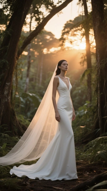 在暖光倾洒的林间,一袭白纱如梦。她静立,身姿曼妙,长纱轻垂,似在等一场与爱不期而遇的奔赴。