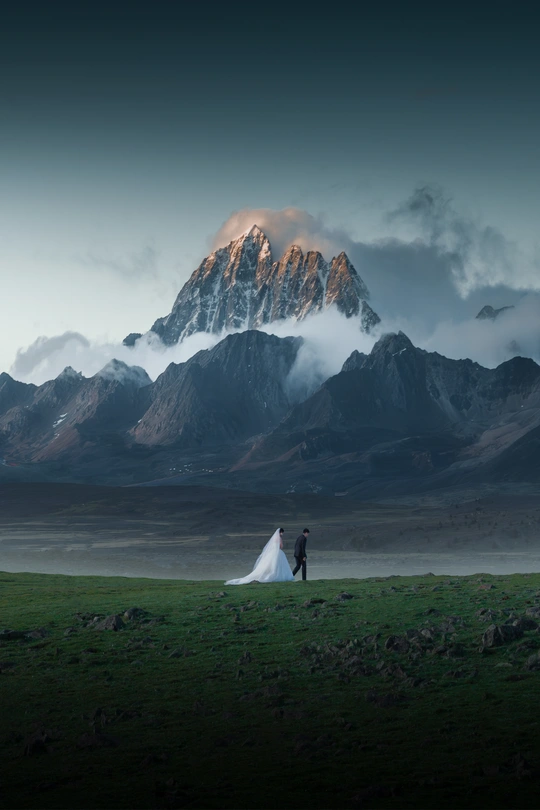 超长焦拍摄,川西鱼子西观景台拍摄。 虽然是蹭拍的新婚模特,但是也能联想出一个美妙的爱情故事:在喧嚣世界的边缘,有一对恋人,他们渴望一场纯粹而震撼心灵的婚礼。女孩一直钟情于高山的雄伟与冷峻,男孩深知她的心意,于是精心策划了这场特别的旅程。他们远离城市的繁华,来到这巍峨的雅拉雪山之下。清晨,第一缕曙光洒在雪山顶峰,那闪耀的光芒仿佛是上天的祝福。云雾缭绕山间,似轻纱般神秘。他们手牵手,缓缓走过这片广袤的草地,脚下的土地,每一步都承载着他们对彼此的承诺。没有华丽的礼堂,没有繁琐的仪式,只有这苍茫天地见证他们的爱情。他们在这片圣洁之地,许下山盟海誓,让高山为他们的爱情永恒伫立,让清风传递他们对彼此的深情,开启只属于他们的、独一无二的幸福篇章。