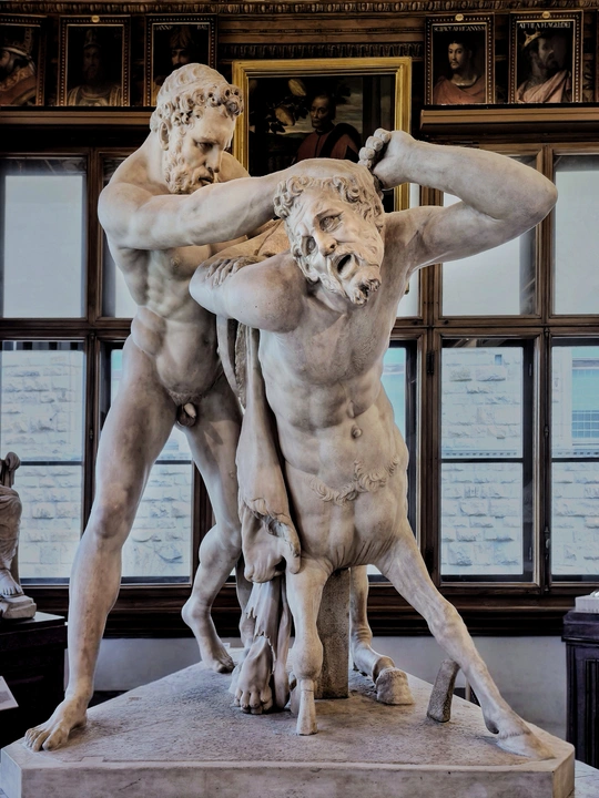 雕塑《赫拉克勒斯与半人马涅索斯》 。 赫拉克勒斯是古希腊神话中宙斯之子,以力大无穷和完成十二项艰巨任务著称。半人马涅索斯违背承诺,欲劫持赫拉克勒斯的妻子得伊阿尼拉,引发这场搏斗。雕塑通过刻画二者扭打姿态,展现出强烈的力量对抗与戏剧性冲突,是古典雕塑艺术的经典之作。