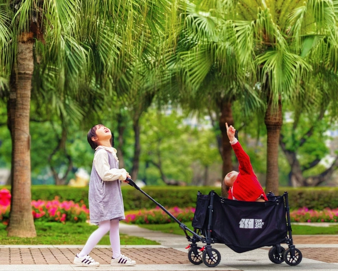 小径旁,棕榈葱郁,繁花相伴。小女孩拉着小推车,笑靥如花。推车里的孩子兴奋指天。她们在自然中嬉闹,童真与美好在此刻绽放