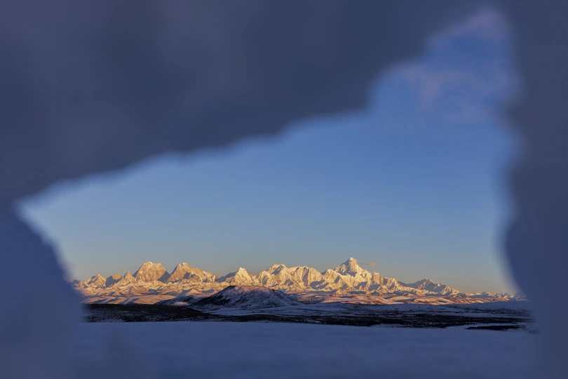 一场大雪刚过,洁白的雪把山峰装点得纯净又肃穆。傍晚时分,金色慢慢爬上了山尖,原本冷峻的雪山镀上了一层金光。在这金色与白色的交织中,天空也被映得金光熠熠。