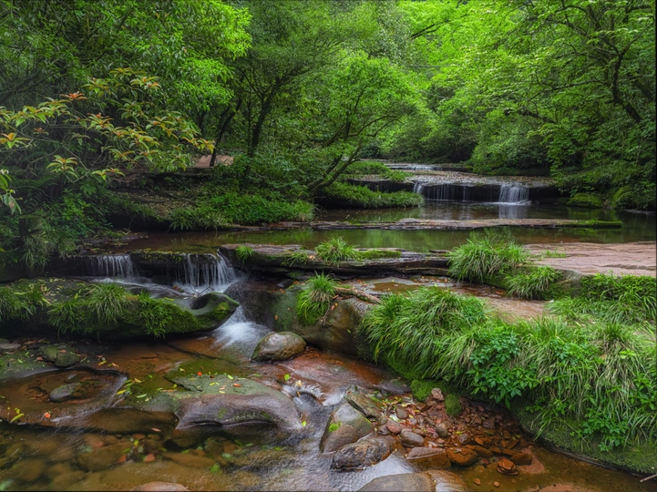 清泉正以翡翠般的流速在苔玉般的岩床上书写诗篇。青苔织就的绒毯托起时光的碎片,每一片坠落的秋叶都是季节写给溪流的明信片。三叠翡翠瀑自林间跌落,水雾氤氲处,阳光正将水晶珠帘雕琢成流动的琥珀。十万片羽状叶在头顶编织穹顶,斑驳光影中传来山雀衔来的清唱,连呼吸都染上了草木的芬芳