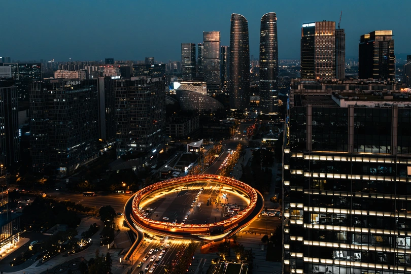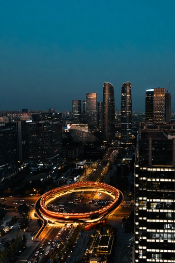 交子之环的钢结构骨架被镀上液态火焰般的光泽,与天幕残留的普鲁士蓝形成冷暖碰撞的视觉奇观。