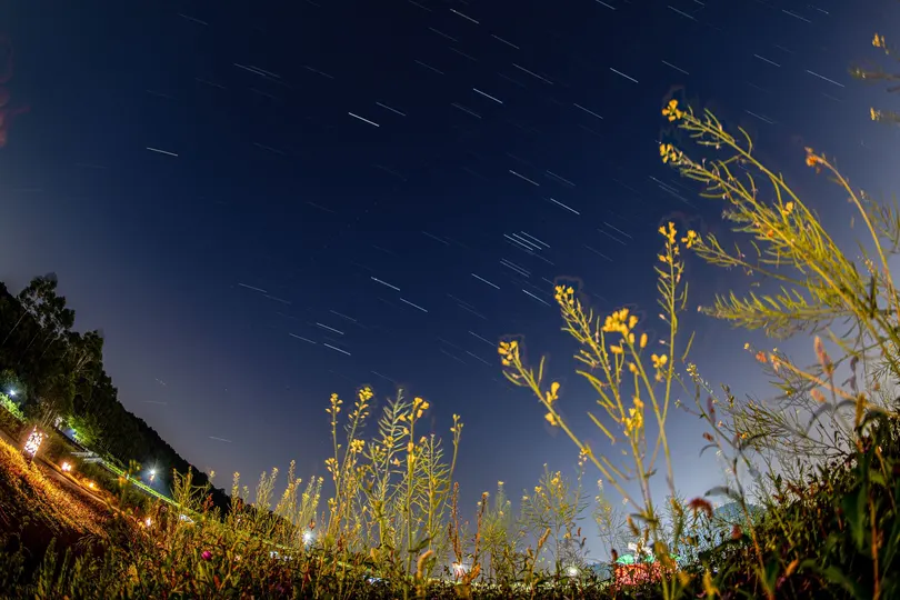 夜幕如墨,繁星似钻,星轨在苍穹间绘出流动的诗行。田野里,油菜花在微光中摇曳,金黄的花朵与璀璨星空相映成趣。远离城市喧嚣,于这方天地,感受宇宙浩瀚与自然的温柔,心灵也在这静谧中寻得了归处。