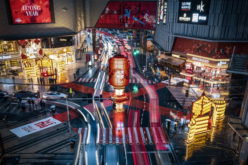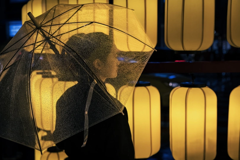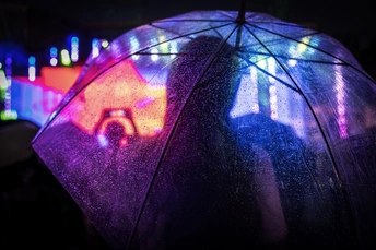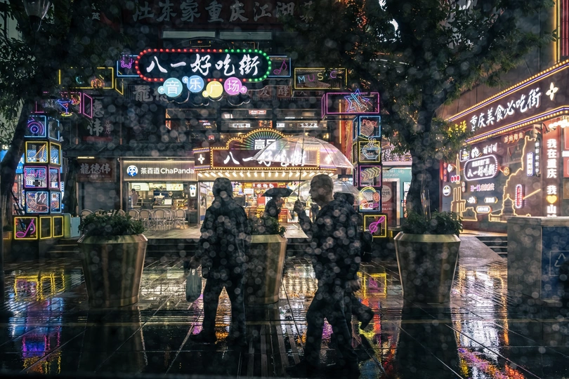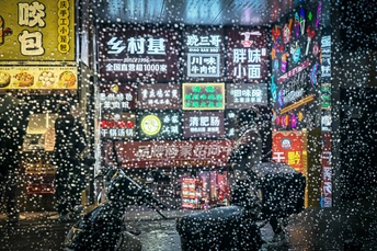 《雨夜霓虹》 以重庆的立体肌理为素材,记录雨水与霓虹共生的魔幻时刻。伞缘垂落的水珠如棱镜切割城市的光谱,霓虹在雨帘中漫射晕染成流动的星云,城市的玻璃幕墙在水珠中折射出赛伯朋克的光影。穿着雨衣的外卖骑手划开街道的镜面,透明伞下移动的身影拖拽出暖调光轨,街道路面的水洼倒映着霓虹碎裂的斑斓色块,潮湿的镜头语言里,山城的层次感被雨水重新解构,每个反光面都在讲述光与暗的对话,镜头在雨中开合,记录这里人们都市的浪漫图谱。