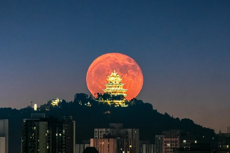重庆鸿恩寺公园洪恩阁的月升时刻。