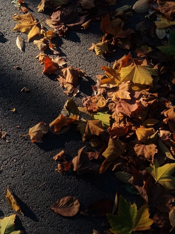 画面定格了秋日街头的一角,枯黄、褐红的叶片零落在粗糙的路面。阳光倾洒,为叶片勾勒出明暗有致的轮廓,光影交错间,秋的寂寥与诗意悄然弥漫,每一片落叶都是季节的信笺,诉说着秋的故事 。