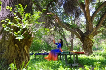 森林里的阳光斑驳,美女一袭长裙格外吸睛。