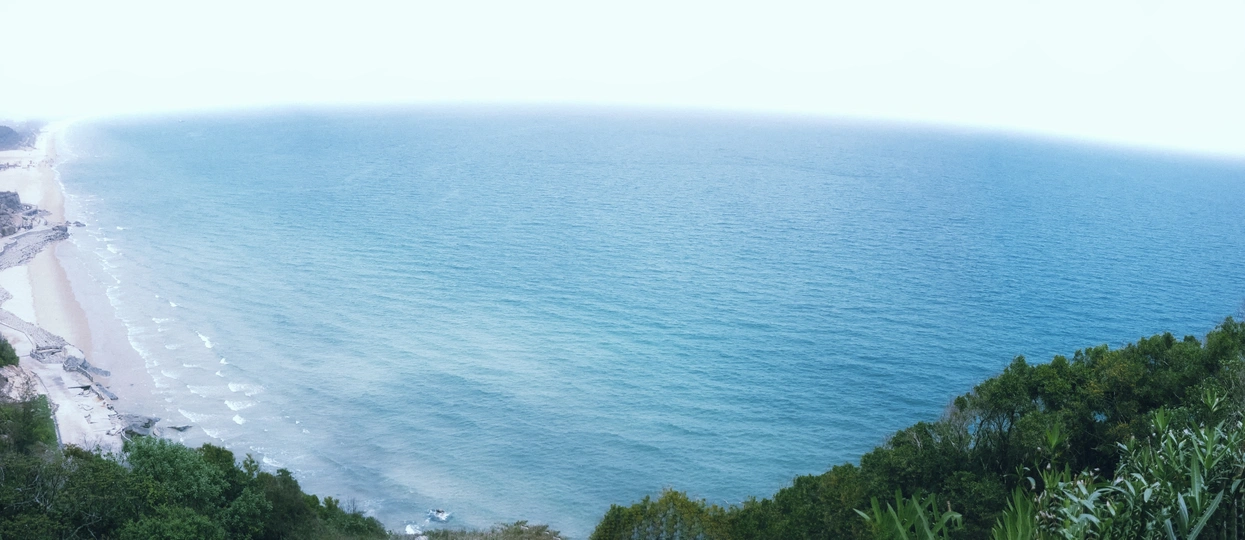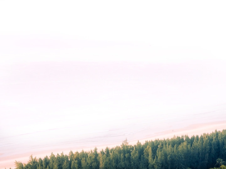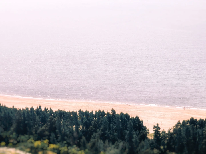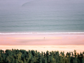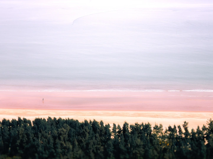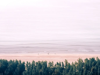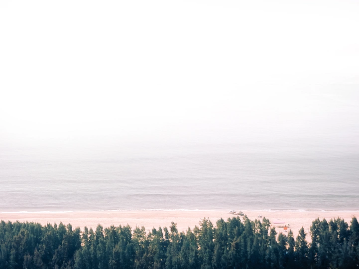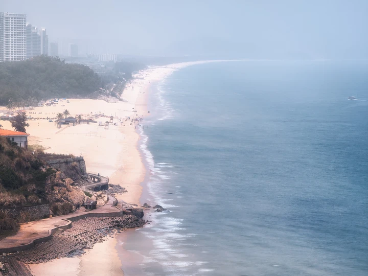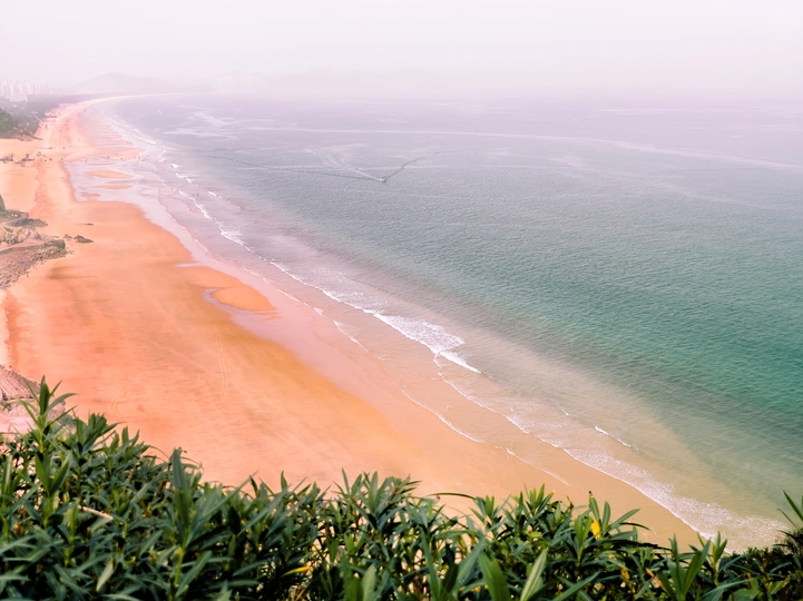 林梢外金滩叠浪,行人踏柔沙,在天海间晕开闲适剪影。