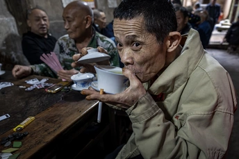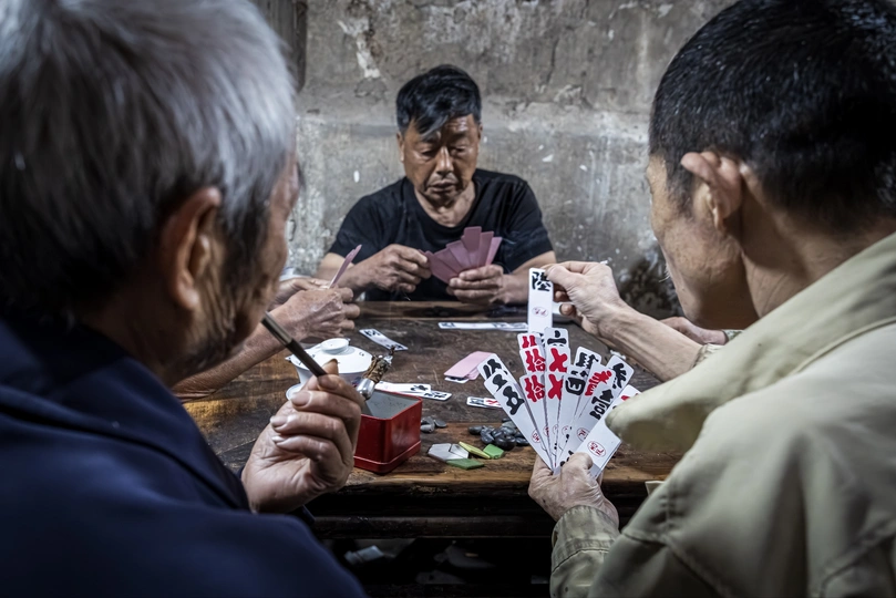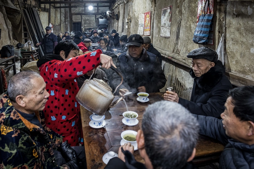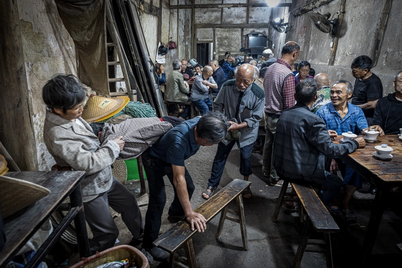 《先市老茶馆写真》 竹席顶棚漏下尘埃,夹壁墙的斑驳里晃着光影。老茶客们蜷在条凳上,白瓷茶船托起青花盖碗,茶叶在日头里浮沉。煤碳灶上铝壶噗噗吐白气,烟杆明灭间,叶子烟与茶香纠缠着爬上房梁。拿牌的手背青筋虬结,嵌着泥星的皱纹随动作流淌。沧桑的脸庞沟壑纵横,像被江水冲刷百年的崖壁,每道褶皱里都蓄着盐粒与日光。浑浊的眸子沉淀着七十场霜降,咧嘴笑时,缺齿的豁口漏出半生叶子烟与苞谷酒的陈酿。龙门阵在八仙桌间弹跳,扑棱棱抖落千脚泥三十载茶道。