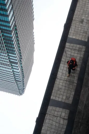 画面中,行人背负行囊,于高楼与步道的缝隙间前行。高耸的大厦象征着都市的繁华与压迫,行人渺小却坚定。此景展现出在庞大都市中,个体于喧嚣与秩序里的孤独探索,以及对前路的执着奔赴。
