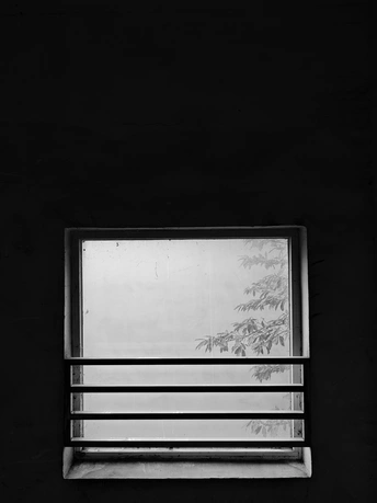 在闭塞昏暗的安全通道里,低矮的方窗投入了丝丝光亮,走到正门,看到几支绿叶随着光量映入黑暗中。