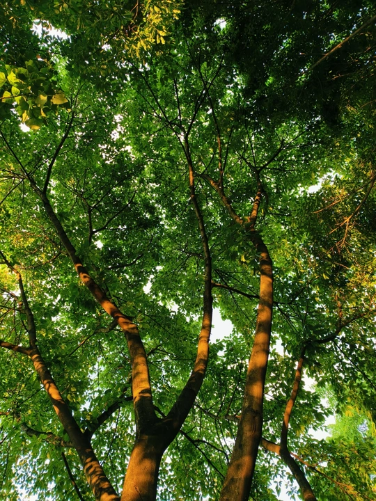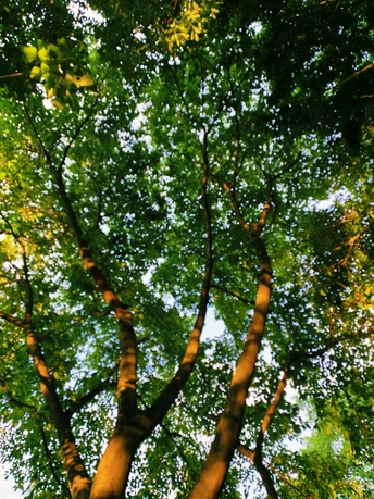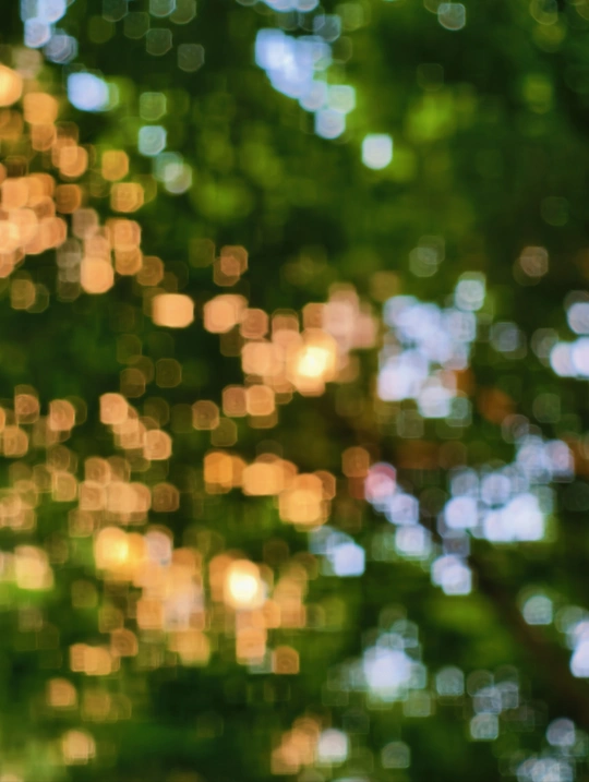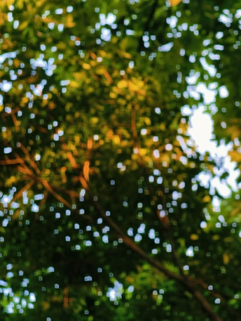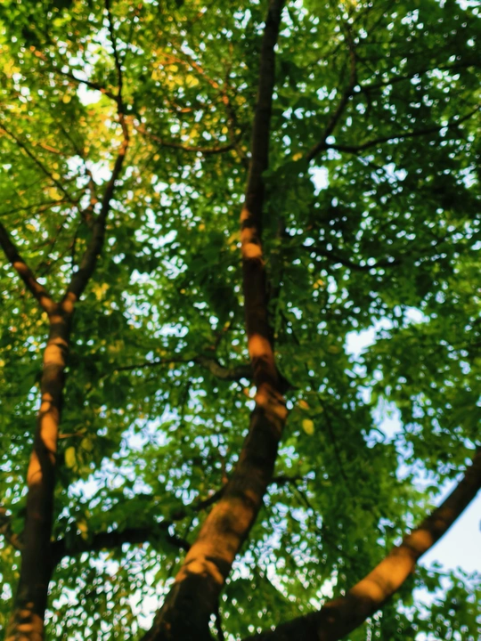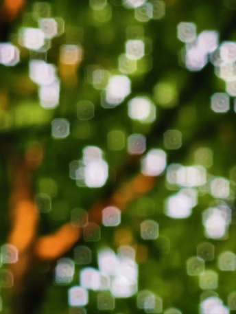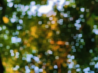 清晨,第一缕阳光穿过树梢,在绿叶间形成七彩梦幻的光斑。