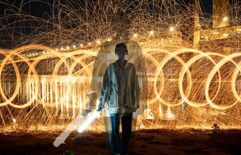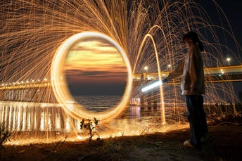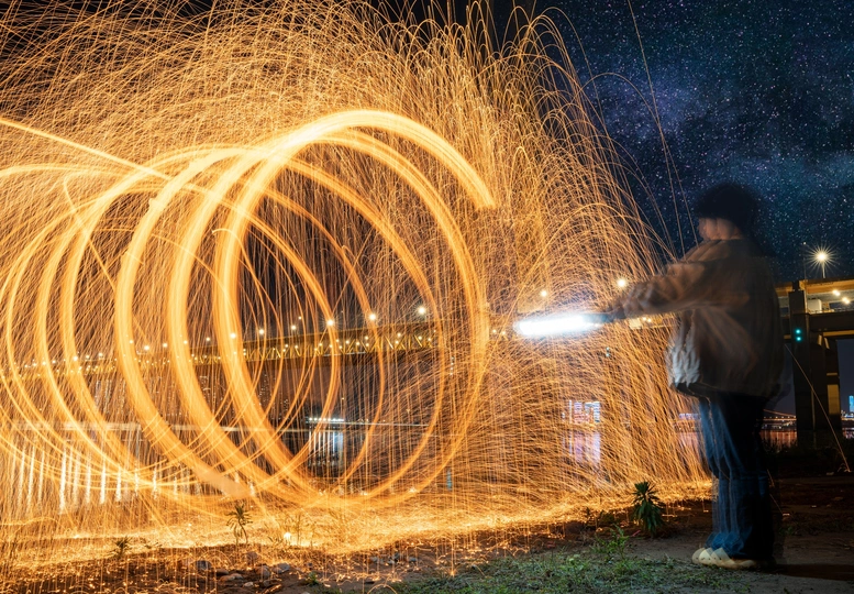 夜幕低垂,江畔风光在灯光下如梦似幻。借助光绘魔法,镜头捕捉绚烂。或是科技感十足的光圈图案,闪耀未来光芒;或是灵动的火圈舞动,挥洒璀璨星火。人与光共舞,在这夜色中勾勒出独属于摄影的奇妙诗篇,将瞬间定格为永恒的视觉盛宴。