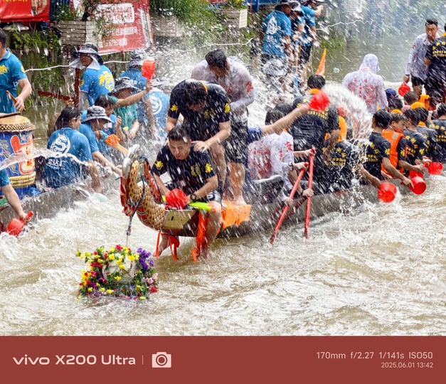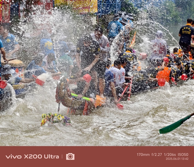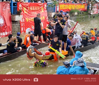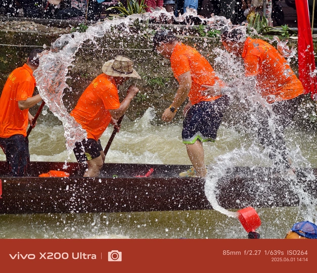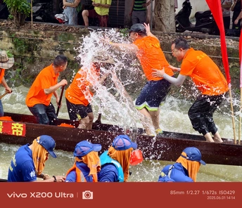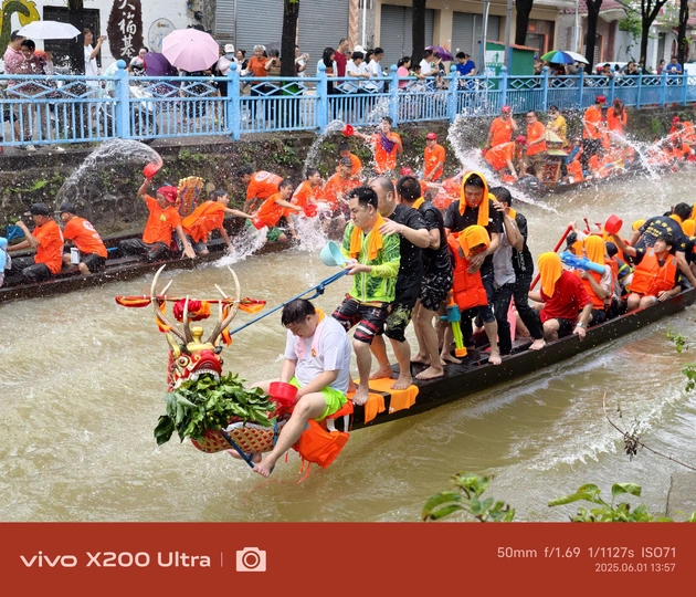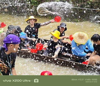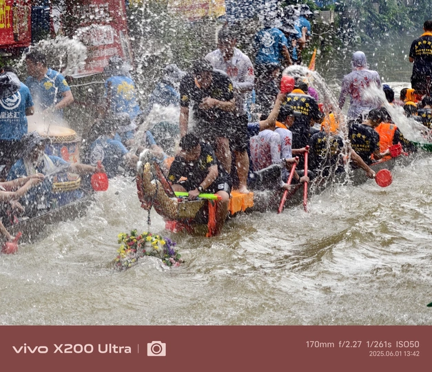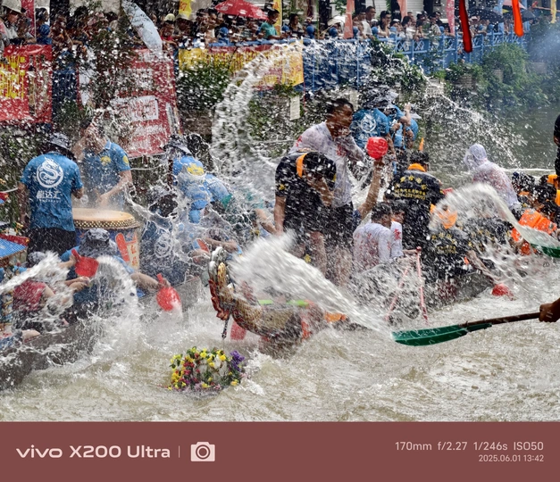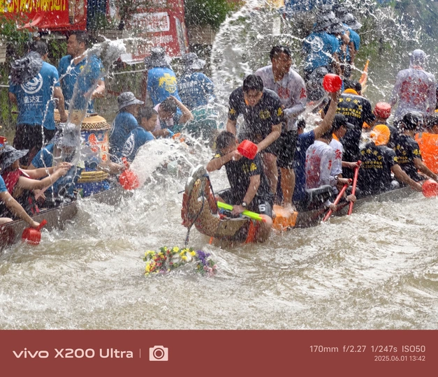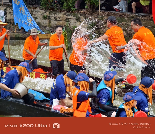 端午节,顺德的龙舟泼水活动热闹非凡。队员们身着色彩鲜艳的队服,头戴质朴草帽,洋溢着蓬勃朝气。手中粉色水桶,成为传递欢乐的法宝,他们尽情泼水,晶莹水花在空中肆意飞舞、绚烂绽放。雨水与河水悄然交融,模糊了界限,却晕染出一片欢乐汪洋。每个人的脸上,都盛开出灿烂笑容,在这场传统民俗与现代欢乐交织碰撞的盛会中,毫无保留地释放着无限活力,将节日的欢腾氛围推向顶点。