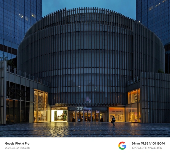 现代感十足的圆形建筑,外立面以竖条格栅装饰,周围高楼林立,底层商铺透出暖光,营造出繁华都市氛围。