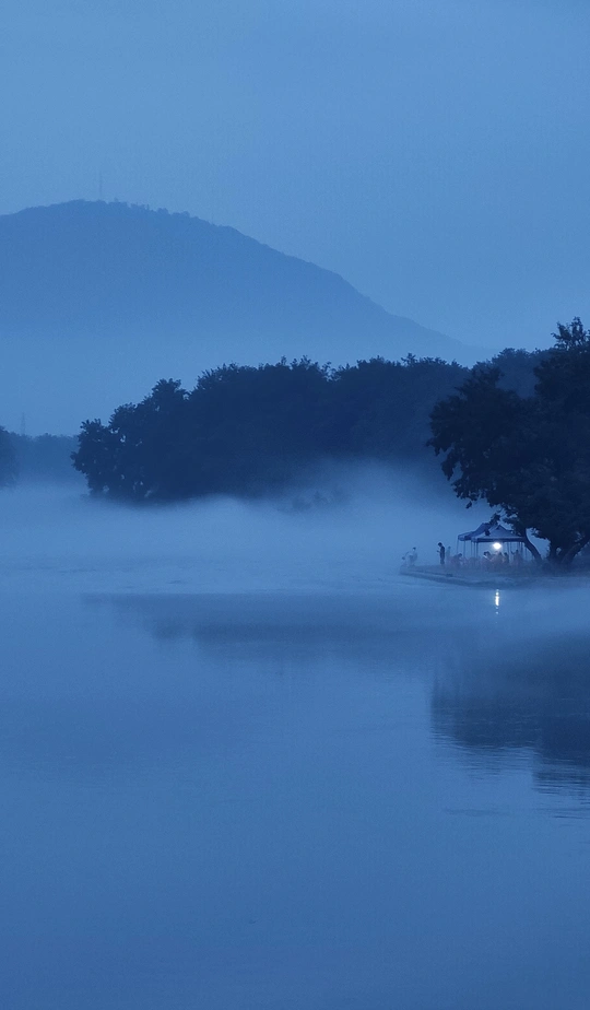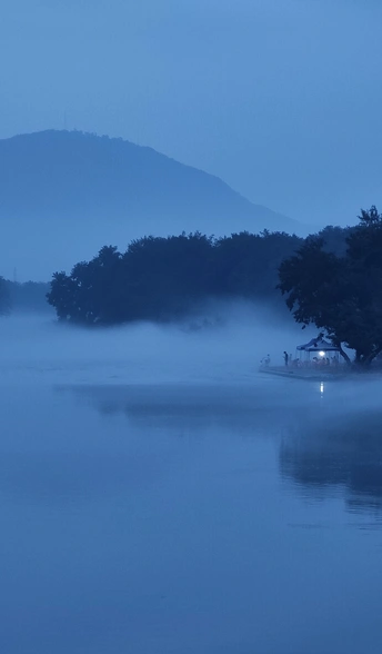 雾锁漓江,如梦仙境; 一点微灯,山远水近; 隔江相望,可否思恋;