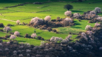 散落在翠绿的青稞田中的娇艳的桃花林,是藏东南春天最美的颜色。西藏林芝市索松村。