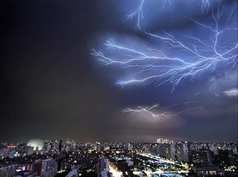5月13日夜,城市上空突降雷阵雨,巨大的闪电划破夜空,就仿佛漆黑的夜幕被树形闪电撕裂。