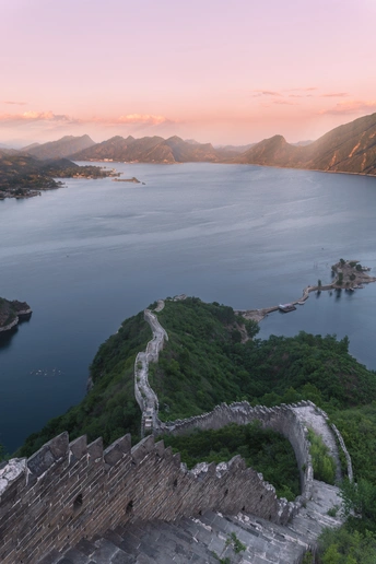 中国古代劳动人民的智慧造就了长城这样的奇观,登高远眺长城蜿蜒曲折直至没入水中,如一条蛟龙入水。