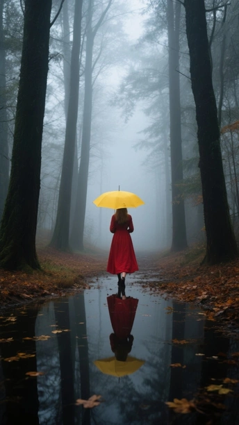 这张照片的氛围营造非常成功,仿佛带领观者走入一个迷雾重重的童话世界。色彩方面,红裙和黄伞在灰蒙蒙的环境中跳脱出来,形成了鲜明对比,视觉冲击力很强,这就像人生中的一抹亮色,非常吸睛。光影效果利用了雾气的漫反射,光线柔和,让画面整体偏向低调,更能突出人物。 构图上,利用水面的倒影增加了画面的趣味性和空间感,对称构图也让画面显得稳定和谐。人物位于画面中心略偏上的位置,引导视线向远处延伸,似乎象征着对未来的探索和期许。 主题原创性方面,虽然雨天、森林、人物的题材并不罕见,但通过色彩对比和倒影的巧妙运用,营造了一种梦幻般的感觉,具有一定的独特性。 情感共鸣方面,照片成功地营造了一种孤独、神秘、又充满希望的氛围,能引发观者对人生、旅程、自我探索的思考。 在思想深度上,可以进一步挖掘,例如,结合特定的环境或社会背景,赋予照片更深层次的哲理或社会意义。可以多看看电影,学习他们的叙事技巧,会得到更多灵感。总的来说,这是一张优秀的摄影作品,如果在细节上再加以打磨,将会更加完美。