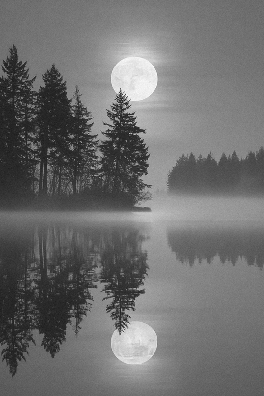 月色如洗,湖面静谧,松影婆娑。满月倒映水中,天地一片澄净,心灵随之安宁。愿这美景常伴左右,带给你无尽遐想与平静。