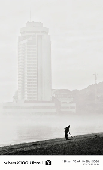 清晨,一场突降的大雾弥漫了海滩,世界仿若被轻柔的白纱笼罩。一位清洁工在朦胧中默默工作着。这雾气恰似自带的柔光滤镜,隐去了杂乱,让他的身影变得更加突出,小而不微,成为清晨中一道动人的风景。