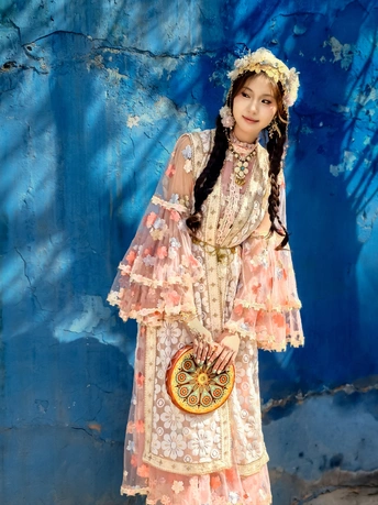 在新疆卡赞其老城区,拍摄了身穿民族服饰的美女,在蓝色墙面的映衬下,显得越发突出美丽。