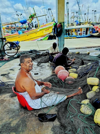 斯里兰卡海边,一位老者边补着渔网,边乐哈哈地露出高兴的笑容,给人一种快乐无忧的感觉。