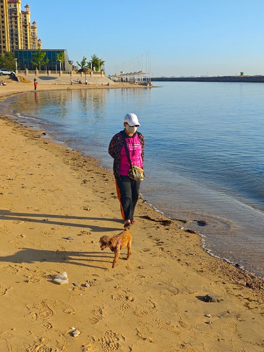 蓝天碧海相伴,一位行人戴着帽子、口罩,惬意漫步在沙滩。身旁小狗欢快随行,脚印在沙上绘出闲适。远处建筑与海天相融,阳光倾洒,这一幕把平凡日常晕染成诗,是人与自然、人与宠物的温柔共处,藏着对生活最本真的热爱 。