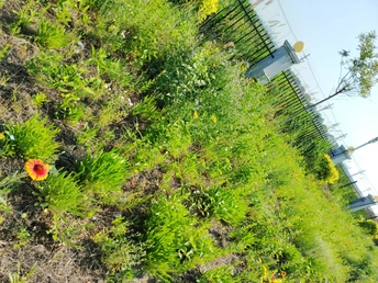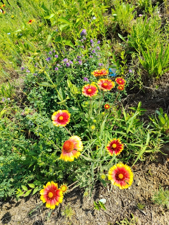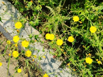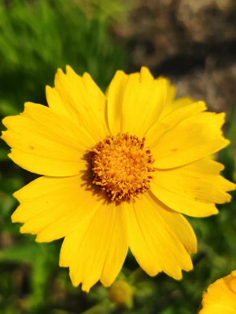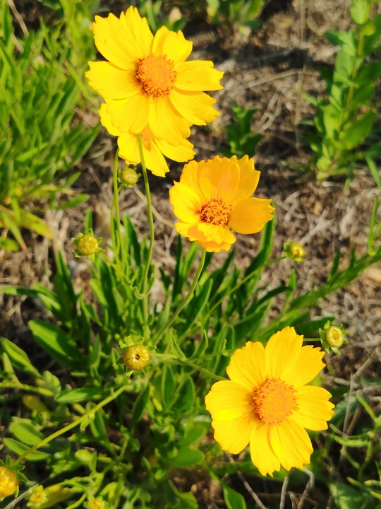 几株金鸡菊在画面中绽放,明黄花瓣如阳光碎片,围绕着橙红花蕊舒展。嫩绿茎叶穿插其间,还有小巧花苞待放,在质朴的土地背景衬托下,透着自然野趣,像把夏日活力凝成了花朵,简单又明亮,满是生机。