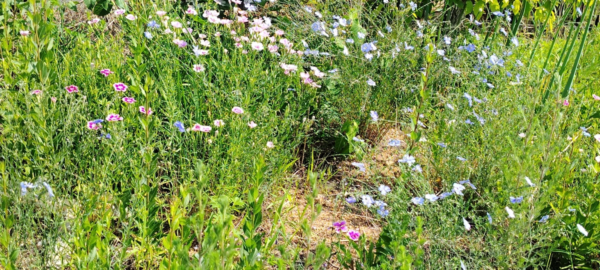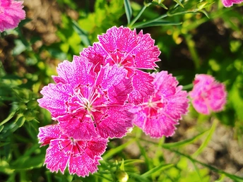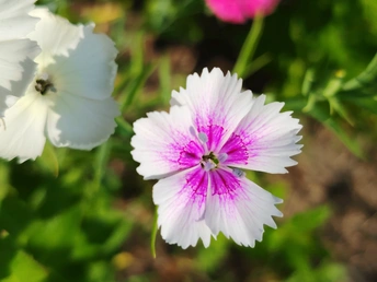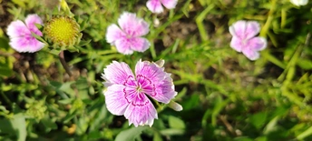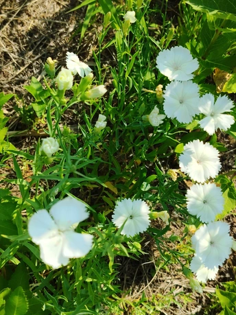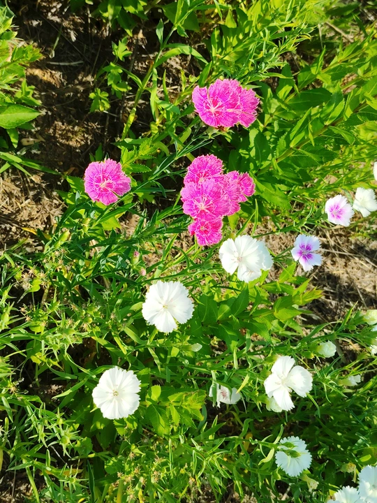 一片石竹花 。粉与白的石竹花错落绽于翠绿草丛,粉花明艳似霞,白花纯净如雪,阳光洒落,花叶光影斑驳,透着自然清新的野趣,像把夏日的浪漫与生机,都藏进这小小的花丛景致里,让人瞥见一抹纯粹的美好 。