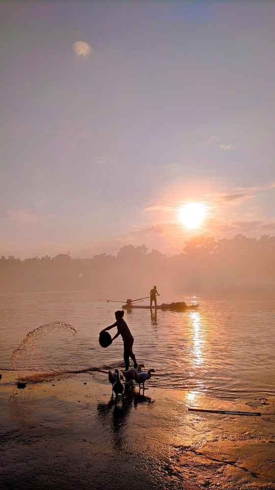 夏天的早晨,温温的凉凉的。捕鱼的,洗衣的,戏水的,晨光懒懒的,一切显得惬意宁静,有点不想去打扰这慢慢的时光……